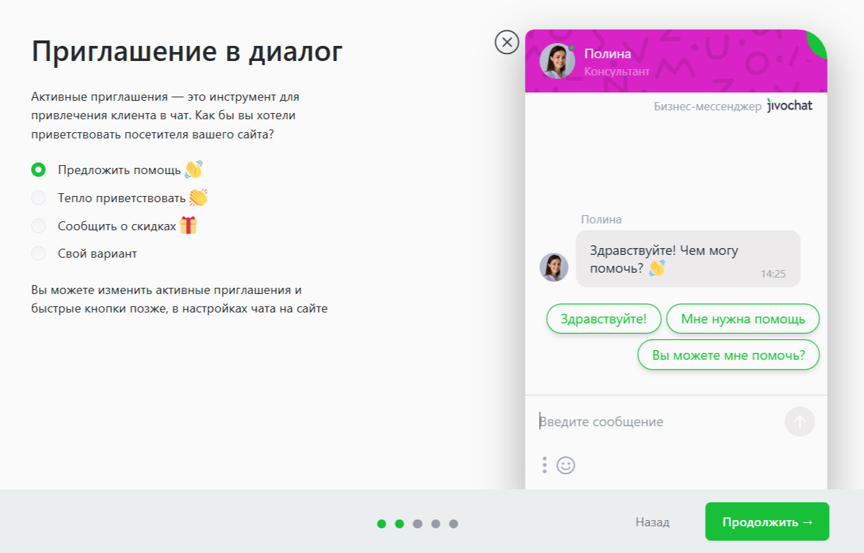 Такие проактивные обращения помогают вовлечь пользователя в диалог и повысить конверсию. Позже можно настроить, кому и когда показывать приглашения — например, в зависимости от времени проведенного на странице или действий пользователя.
