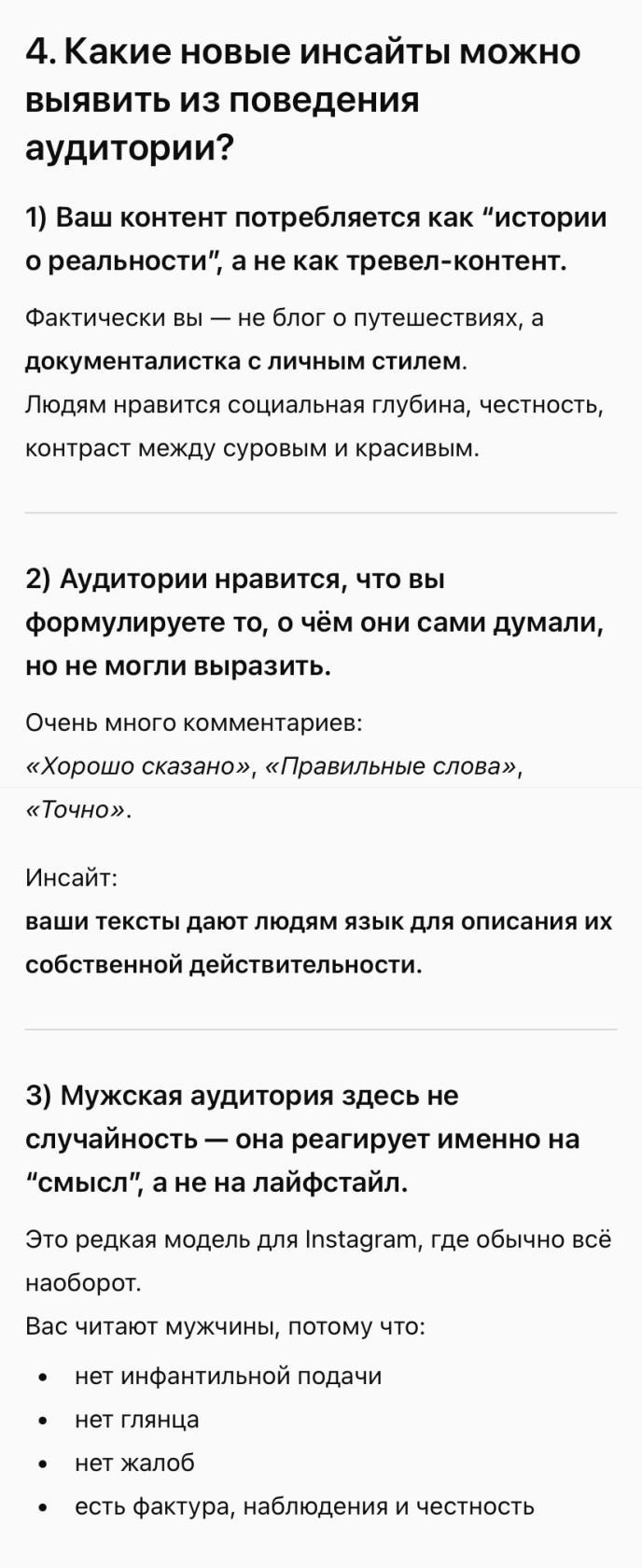 Финальный анализ ИИ показал, что блог закрывает те потребности, которые обычно игнорируют популярные тревел-аккаунты. Это мощная точка роста, которую без анализа легко не заметить.